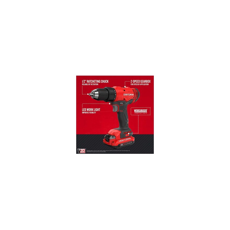1/2 pulgadas. Taladro inalámbrico / conductor con motor de alto rendimiento produce 320 vatios de unidad para completar una variedad de aplicaciones. Caja de cambios de 2 velocidades con velocidades de 0500/01, 800 para velocidad de sujeción. El portabrocas de trinquete de 0.5 in proporciona una mejor retención de la broca. La luz LED mejora la visibilidad en áreas de trabajo oscuras. Incluye batería de litio de 20 V max* con celdas de alto rendimiento que proporciona un amplio tiempo de autonomía y un mayor rendimiento. 20 V MAX* Cargador de litio proporciona 60 minutos o menos tiempo de carga en la batería incluida Compatible con gancho para colgar Versatrack. Número de parte CMCD701C2 Peso del producto 5.85 pounds Dimensiones del producto 15 x 8 x 2.5 pulgadas Número de modelo del producto CMCD701C2 Pilas 2 Lithium ion necesaria(s), incluida(s) Estilo Drill Kit Material Plastic Fuente de energía Battery Powered Cantidad de paquetes de artículos 1 Sistema de medición Metric Componentes incluidos CMCD701 Drill/Driver, (2) 20V MAX* Lithium Ion Battery, 20V MAX* Lithium Ion Charger ¿Se incluyen las baterías? Sí ¿Se necesitan baterías? Sí Tipo de celda de batería Lithium Ion